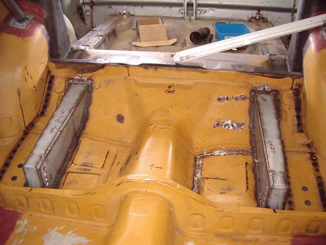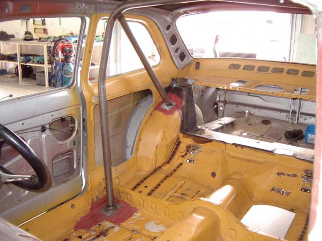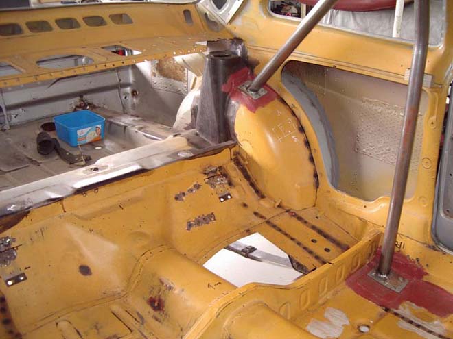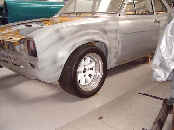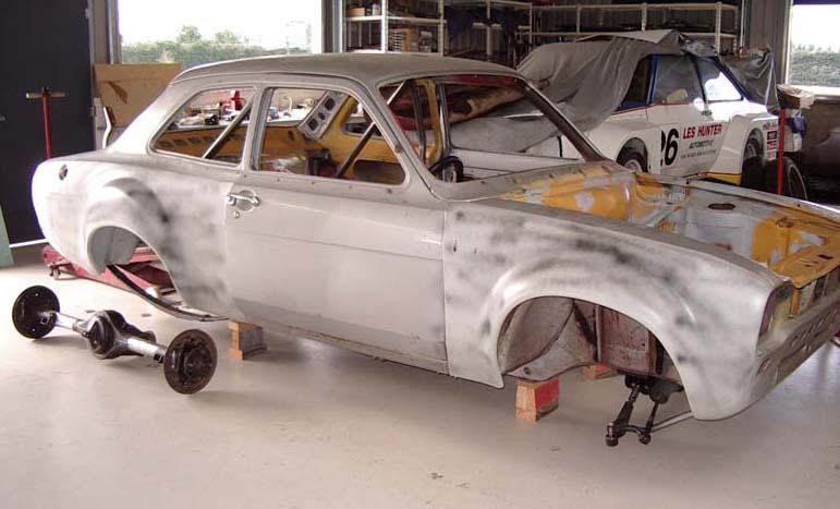 MK I Escort 2 door fitted with “forest” rally flares. Rear shock turrets fitted; 4 link boxes fabricated in-house by Les Hunter Racing Products and fitted. Rest of body is basically stock. Bolt in roll cage fabricated and fitted by Les Hunter Racing Products to comply with MSNZ homologation rules.