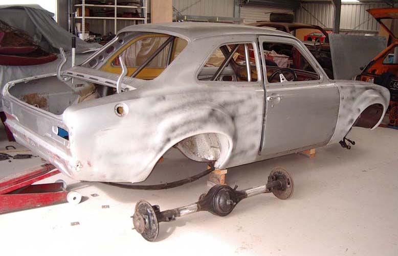 MK I Escort 2 door fitted with “forest” rally flares. Rear shock turrets fitted; 4 link boxes fabricated in-house by Les Hunter Racing Products and fitted. Rest of body is basically stock. Bolt in roll cage fabricated and fitted by Les Hunter Racing Products to comply with MSNZ homologation rules.