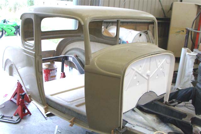 Fibreglass channelled over chassis approximately 80 mm and roof to be chopped approximately 65 mm. All this work to be carried out by Magoo Street Rods.