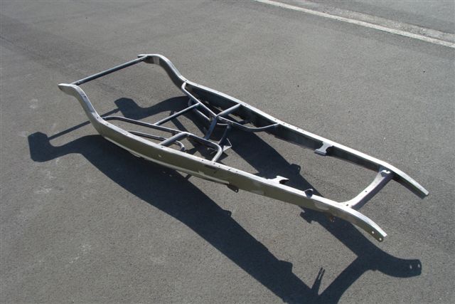 To be an original style reproduction frame rail fully boxed with modern type cross members including engine mounts and gear box mounts. Rear section kicked up to allow for channel of body. This to be built by Magoo Street Rods.